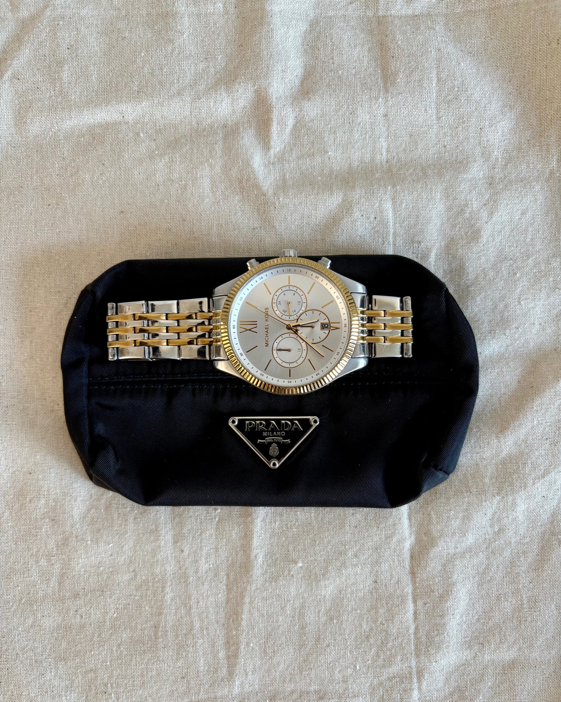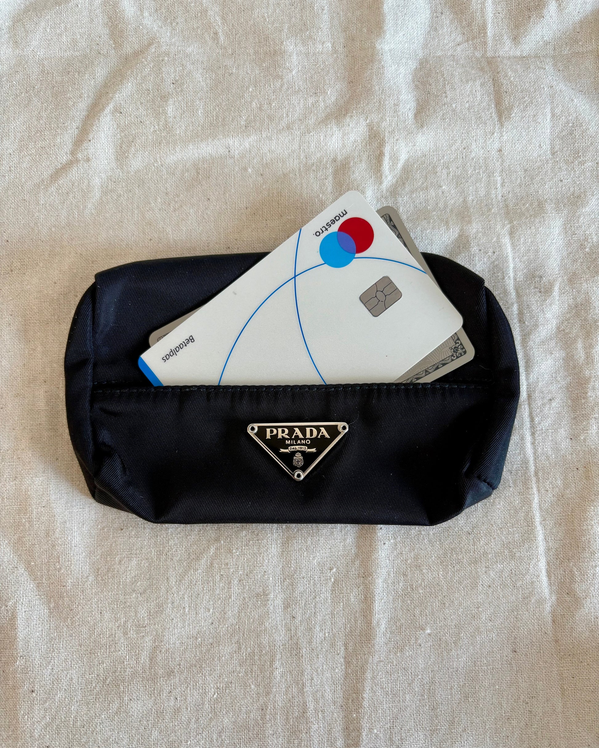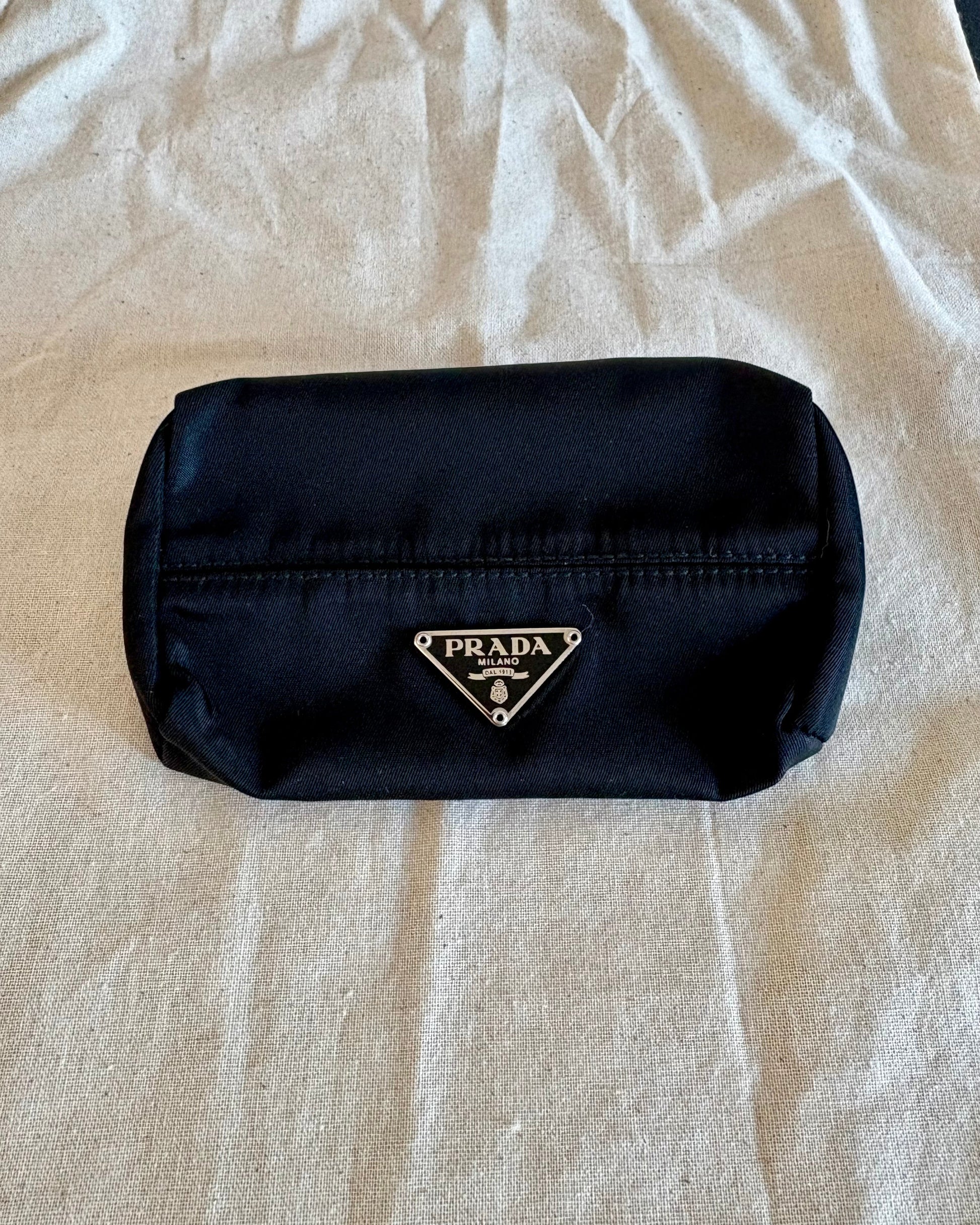 Prada’s iconic black nylon travel case with saffiano-style lining, silver-tone zip and black enamel logo. Lightweight, structured, and quietly luxurious. Perfect for daily essentials, wherever you go.